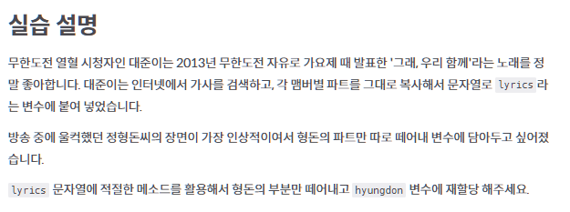 문제의 의도인 형돈의 가사만 떼어내는 것이 아닌, 원하는 멤버의 이름을 입력했을 때 그 멤버의 가사를 알 수 있도록 하는 함수를 만들어 범용성 있게 제작해보고자 한다.